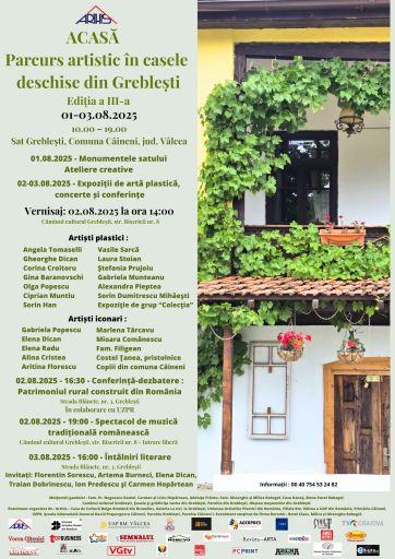 Ajuns anul acesta la cea de-a treia ediție, evenimentul cultural ACASĂ-parcurs artistic în casele deschise din Greblești s-a desfășurat în perioada 01-03 august 2025, cunoscând forfota specifică marilor evenimente culturale. A fost un eveniment cultural organizat de soții Liviu și Carmen Hopârtean, cu rădăcini de familie în satul Greblești-Vâlcea. Oameni inimoși care, cu sprijinul și participarea autorităților locale, a reprezentanților unor importante instituții culturale județene și naționale, au pus umărul la ridicarea numelui comunei Câineni, pe harta localităților active din punct de vedere cultural, din România.